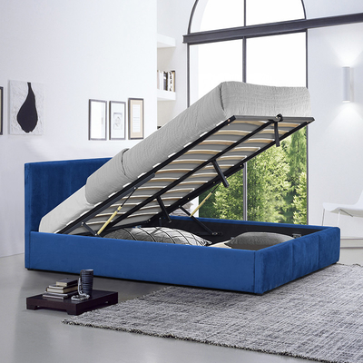 سرير تخزين خشبي منجد باللون الأزرق المخملي بحجم كينج